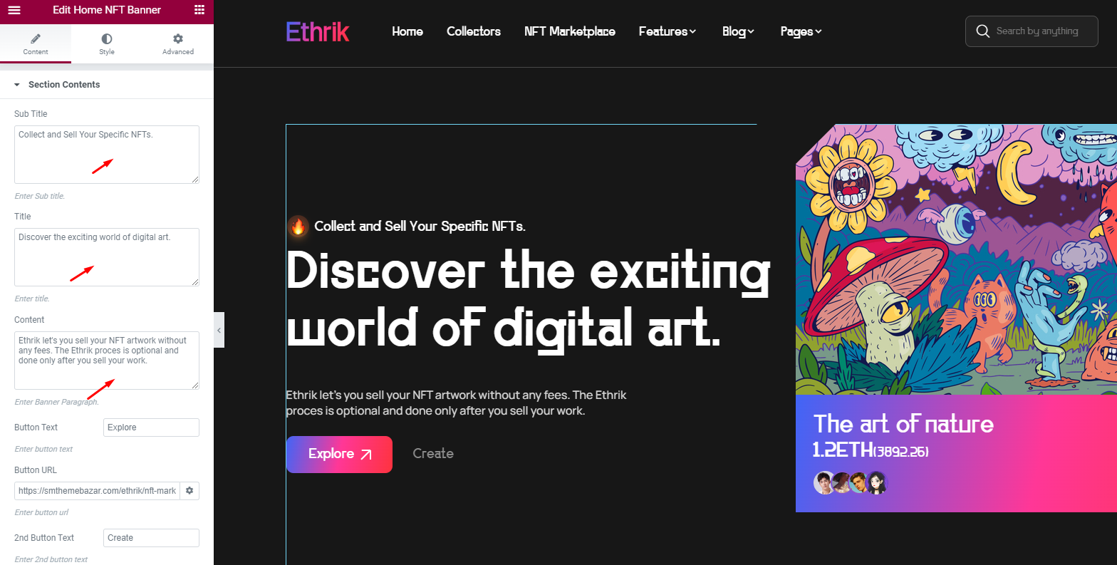 You can manage all Theme Settings & Options from WordPress dashboard. Go to Appearance > Dashboard > Theme Option to access all theme settings sections. Ethrik Option panel is Easy, lighweight and friendly to use. You can easily setup necessary parts of Your NFT Marketplace website.
