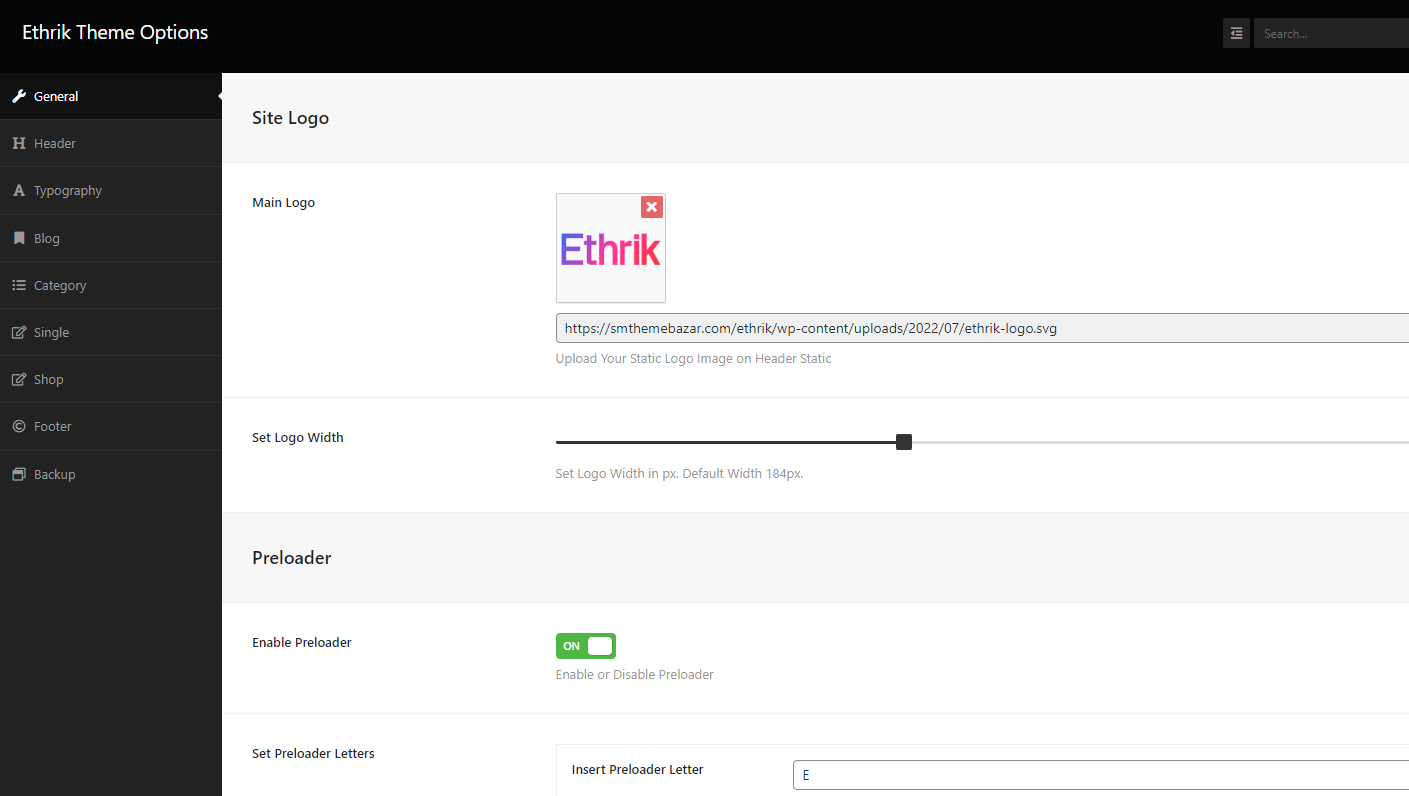 General Tab: You can enable/disable Theme Loader and back to top Arrow.